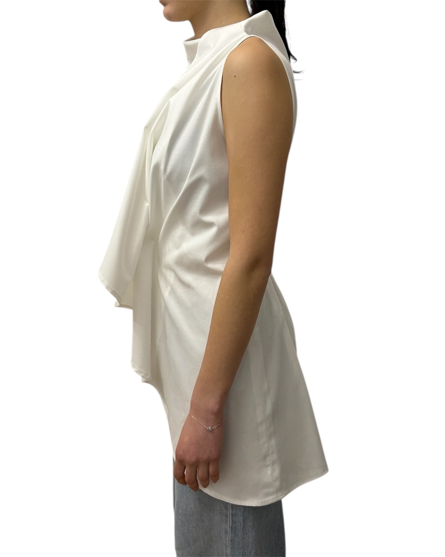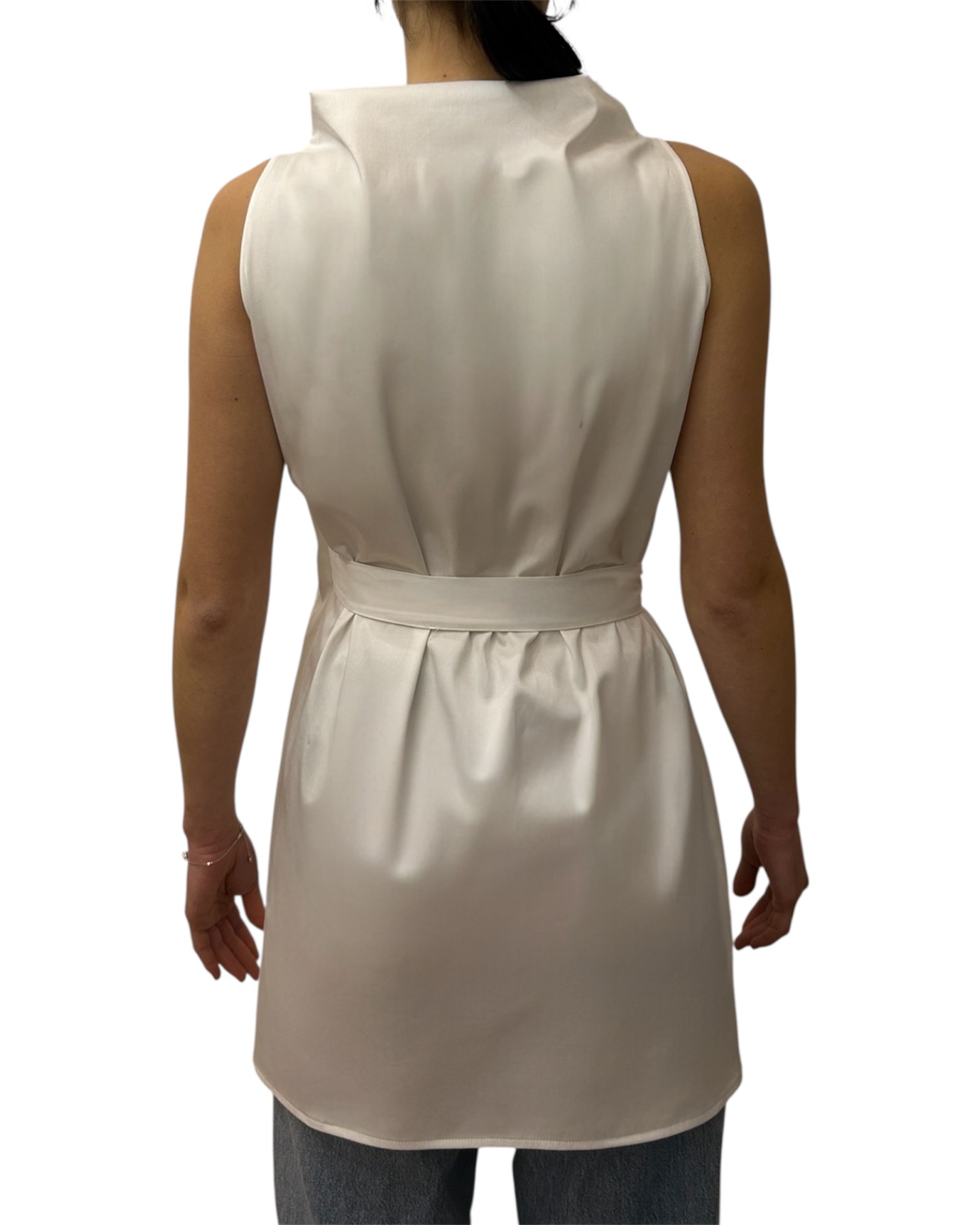 Casacca in popeline di cotone con collo a cratere, davanti a doppiopetto regolabile con lacci.